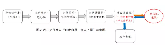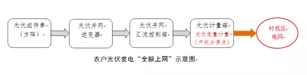 分布式光伏扶貧電站采用“全額上網”方式接入,在一個臺區變以內的戶用光伏扶貧裝機功率如果控制在當地電網公司要求的25%指標以內,其接入和計量的方法與普通農戶光伏是一致的。但如果整村推進安裝光伏時,則按村級電站并網接入方式執行。