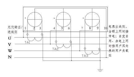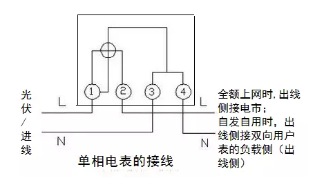 光伏發電功率較小時(一般在8KW以下),使用單相輸出的并網逆變器,安裝單相電表。如下圖(注意兩種運行方式的不同):
