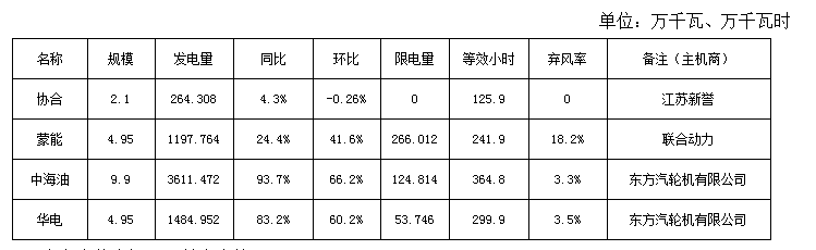 2017年11月份,我市風電發電量6558.496萬千瓦時,同比增長68.6%,環比增長55.7,限發電量444.572萬千瓦時,綜合棄風率約為6.3%,等效發電小時約299.5小時。其中,長風協合2.1萬千瓦風電場發電量為264.308萬千瓦時,無限發電量,等效發電小時約125.9小時。蒙能新能源4.95萬千瓦風電場發電量為1197.764萬千瓦時,限發電量266.012萬千瓦時,等效發電小時約241.9小時。中海油9.9萬千瓦風電場發電量為3611.472萬千瓦時,限發電量124.814萬千瓦時,等效發電小時約364.8小時,為我市11月份風力發電等效發電小時數最高。華電風光互補4.95萬千瓦風電場發電量為1484.952萬千瓦時,限發電量53.746萬千瓦時,等效發電小時約299.9小時。