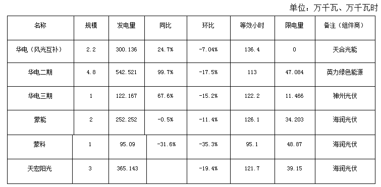 2017年11月份,我市光伏發電量為1677.309萬千瓦時,同比增長67.1%,環比下降16.5%,限發電量180.773萬千瓦時,等效發電小時約139.8小時。其中,華電風光互補電場2.2萬千瓦光伏發電場發電量為300.136萬千瓦時,等效發電小時約136.4小時,為我市11月份光伏等效發電小時數最高。華電二期4.8萬千瓦光伏發電場發電量為542.521萬千瓦時,等效發電小時約113小時。華電三期1萬千瓦光伏發電場發電量為122.167萬千瓦時,等效發電小時約122.2小時。蒙能新能源2萬千瓦光伏發電場發電量為252.252萬千瓦時,等效發電小時約126.1小時。蒙科金太陽1萬千瓦光伏發電場發電量為95.09萬千瓦時,等效發電小時約95.1小時。天宏陽光3萬千瓦光伏發電場發電量為365.143萬千瓦時,等效發電小時約121.7小時。