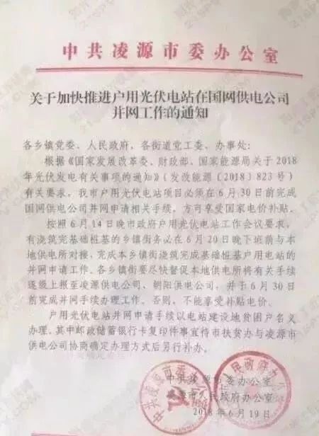 通知明確依據2018年關于光伏發電有關事項823號文件有關要求。戶用電站項目必須在6月30日前完成國網供電公司并網申請相關手續可享受國家電價補貼。否則不能享受補貼電價。