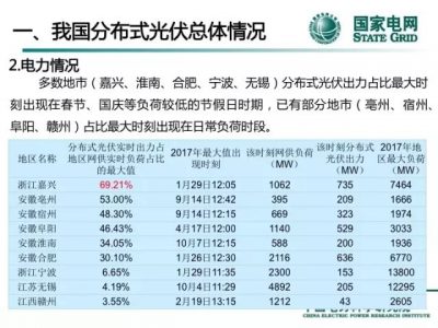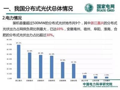 嘉興分布式光伏出力占網(wǎng)供負(fù)荷最大值達(dá)到69%。2017年1月19日12:05,嘉興的分布式光伏發(fā)電功率735兆瓦,當(dāng)時(shí)系統(tǒng)網(wǎng)供負(fù)荷僅為1062兆瓦,比值達(dá)到69%。這是春節(jié)期間的情況。