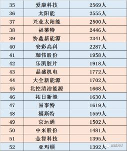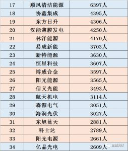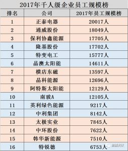 ? ? ? ?據(jù)黑鷹光伏統(tǒng)計(jì),2017年184家光伏企業(yè)員工規(guī)模33.94萬(wàn)人,同比增長(zhǎng)了4.3%。員工規(guī)模在千人以上的大型企業(yè)共有57家,達(dá)到萬(wàn)人規(guī)模的企業(yè)達(dá)10家。前三名為正泰電器、通威股份和保利協(xié)鑫。
