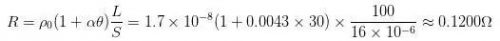 其次,我們需要知道零線電纜的電阻是多少。這個(gè)值可以根據(jù)具體線路參數(shù)來(lái)考慮。方便起見(jiàn),不妨先規(guī)定這條零線電纜的長(zhǎng)度是100米,電纜芯線截面是16平方毫米,它的工作溫度是30攝氏度,則它的電阻為:![]()