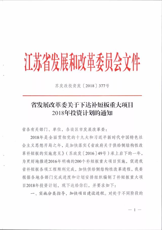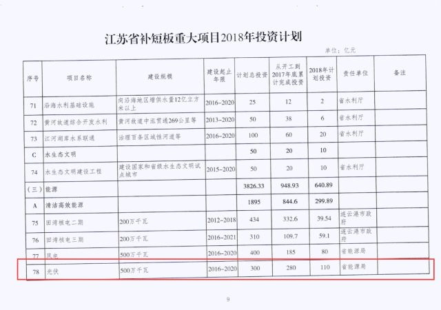 ? ? ? ?日前,江蘇省發展和改革委員會發布《關于下達補短板重大項目2018年投資計劃的通知》。通知指出江蘇省2018年下達補短板重大項目投資計劃3600億元。其中光伏被列于“清潔高效能源”之列,從2016-2020年安排總建設規模500萬千瓦,計劃總投資300億,2018年計劃投資110億元。