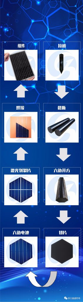 采用六邊形單晶硅片制作電池片,單晶硅棒切方從四邊形方棒改為六邊形方棒,單晶硅片從四邊形改為六邊形;組件由電池片、互聯(lián)條、匯流條和絕緣膜組成電池片排版,采用電池串交錯排版樣式。使用該技術,截斷后的單晶成品棒利用率相比傳統(tǒng)四邊開方增加了19%,單晶硅片的非硅成本下降10%以上,與市場現(xiàn)有單晶組件產(chǎn)品相比,除了其天生的成本低外,其性能優(yōu)勢也十分明顯。“蜂巢”組件的電流降低至常規(guī)組件的1/3。現(xiàn)下線產(chǎn)品單晶50版型標稱功率為280-300W,輸出電壓高達120V,單晶PERC50版型標稱功率為300-320W。同時“蜂巢”技術可以兼容使用市場上多種高效電池技術的疊加結合,比如PERC、PERL、PERT、HIT、IBC等,提升組件效率。