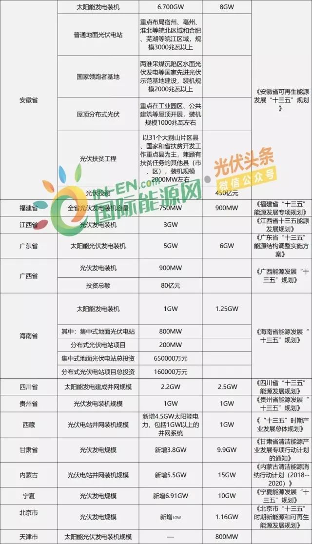 多個省份已出臺多種版本的政策解讀文件,部分電網(wǎng)企業(yè)甚至以光伏新政為由停止了分布式光伏發(fā)電的并網(wǎng)、代備案和補貼墊付等相關(guān)工作,這無疑使寒冬期的光伏投資者“雪上加霜”。在存貨壓力、資金壓力驟增的情況下,目前,各地規(guī)劃光伏建設(shè)規(guī)模到底有多少?我國各地光伏投資規(guī)模到底有多大?筆者特此分析我國各省下發(fā)的能源相關(guān)“十三五”規(guī)劃,以了解各地“十三五”期間的光伏規(guī)劃裝機容量、投資額、重點工程以及建設(shè)方向,供讀者參考。