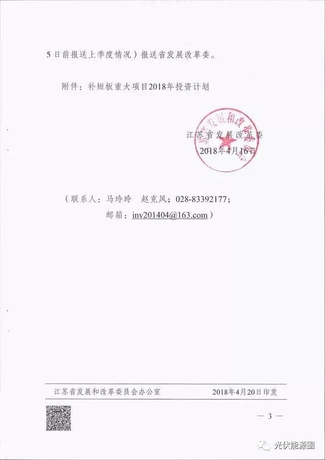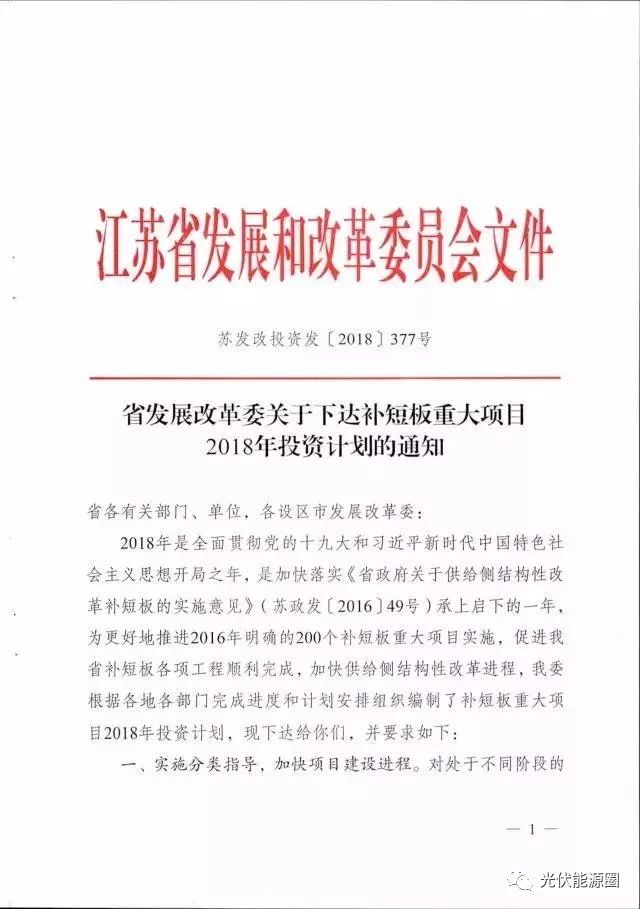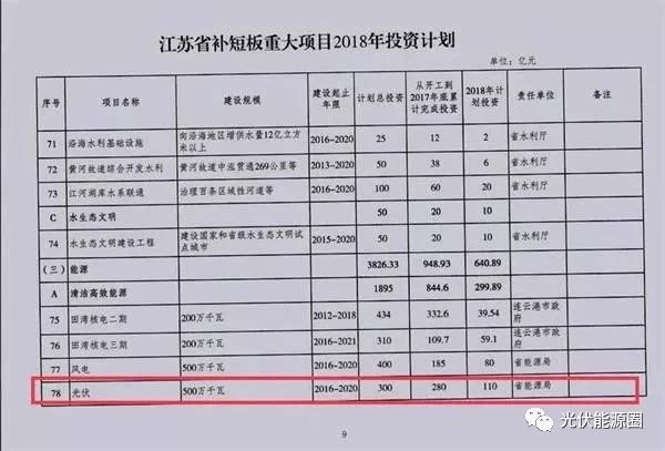 日前,江蘇省發展和改革委員會發布《關于下達補短板重大項目2018年投資計劃的通知》,其中光伏從2016-2020年安排總建設規模500萬千瓦,計劃總投資300億,2018年計劃投資110億元! 原文如下: