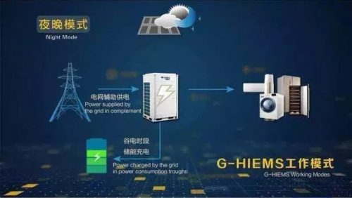 夜晚,光伏發電系統不發電,電網輔助供電,儲能設備在谷段時充電。