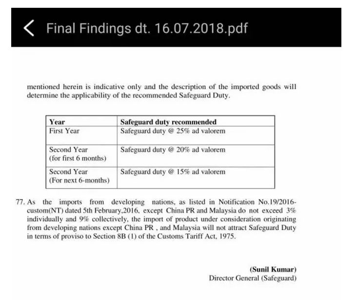 7月16日,印度光伏保障措施案作出終裁,貿(mào)易救濟(jì)總局建議以首年25%,次年上半年20%,下半年15%的稅率,對(duì)進(jìn)口電池片及組件征收兩年的保障措施稅。