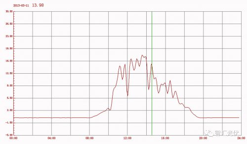 光功率預(yù)測主要是基于太陽能輻照度的預(yù)報和光伏項目IV曲線進行模型仿真。其預(yù)測的準(zhǔn)確度取決于項目所在地的長期歷史數(shù)據(jù)及短期氣象觀測數(shù)據(jù)。太陽能輻照度數(shù)據(jù)受到大氣透明度、水汽含量、氣溶膠、云量、云狀、溫度、濕度等因素的影響。這其中,其他氣象要素的變化相對較慢,而云量數(shù)據(jù)的隨機性最大。因此,云量數(shù)據(jù)對超短期預(yù)測影響最大。忽然飄來的一片云都會使電站發(fā)電量瞬間降低,下圖為某電站多云天氣的出力曲線。可見,多云天氣時很難實現(xiàn)光伏電站的超短期預(yù)測的高準(zhǔn)確度。