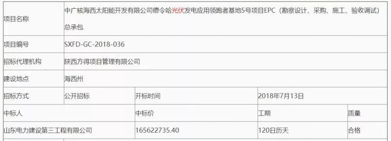 日前,中廣核公布其在德令哈100MW光伏發(fā)電應(yīng)用領(lǐng)跑者地5號(hào)項(xiàng)目EPC總包結(jié)果。結(jié)果顯示,山東電建第三工程公司以1.65億元獲得此項(xiàng)目。筆者根據(jù)招標(biāo)內(nèi)容計(jì)算,本次EPC單價(jià)為1.65元/W。(EPC采購(gòu)不含光伏組件及逆變器)