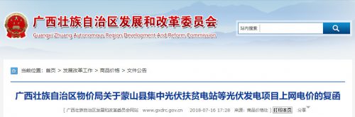 7月16日,廣西發改委下發《廣西壯族自治區物價局關于蒙山縣集中光伏扶貧電站等光伏發電項目上網電價的復函》。