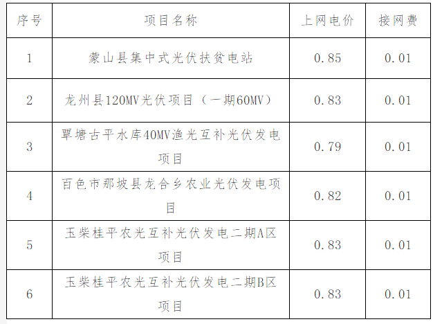 1、蒙山縣集中光伏扶貧電站等6家光伏發電項目上網電價按照附件表格執行;其中,蒙山縣集中光伏扶貧電站上網電價最高,為0.85元/千瓦時;