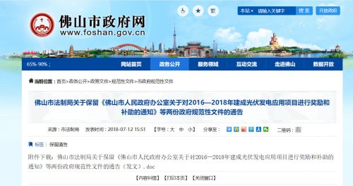 7月12日,佛山市政府網(wǎng)發(fā)布了佛山市法制局關(guān)于保留《佛山市人民政府辦公室關(guān)于對2016—2018年建成光伏發(fā)電應(yīng)用項目進行獎勵和補助的通知》等兩份政府規(guī)范性文件的通告。