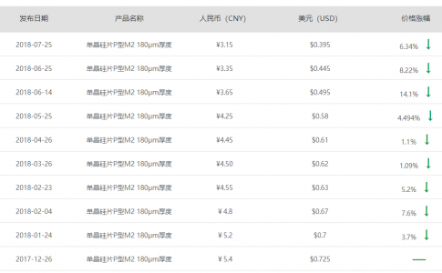 180μm厚度P型M2單晶硅片價格由國內(nèi)每片3.35元人民幣、海外0.445元美金降至國內(nèi)每片3.15元人民幣、海外0.395元美金 ,每片下降0.2元人民幣、0.05元美金,價格跌幅為5.97%。