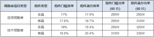 2018年,中國(guó)第三批領(lǐng)跑者項(xiàng)目規(guī)模共計(jì)6.5GW,其中應(yīng)用領(lǐng)跑者項(xiàng)目5GW,技術(shù)領(lǐng)跑者項(xiàng)目1.5GW,技術(shù)指標(biāo)要求如下表所示: