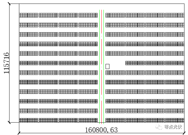 案例,在一個(gè)規(guī)則的長(zhǎng)方形中,設(shè)計(jì)光伏組件總?cè)萘考s21.736MW,支架單元數(shù)1900套,每個(gè)支架單元安裝44塊260Wp光伏組件。場(chǎng)地東西長(zhǎng)約600米,南北寬約660米。方陣總平面圖布置方式,豎向雙排均采用1.086MW模塊化設(shè)計(jì),而橫向四排的布置方式,大部分采用模塊化設(shè)計(jì),剩余場(chǎng)地采用非模塊化設(shè)計(jì)。總平圖主要設(shè)計(jì)3條豎向道路和一條橫向道路,一圈環(huán)場(chǎng)道路,路網(wǎng)設(shè)計(jì)完全一致。