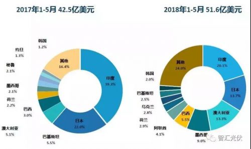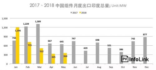 2018年開始,由于擔心貿易稅的影響,中國上半年對印度出口同比下降33%,2018年1~6月份,中國針對印度出口的光伏組件約為3.6GW,占到總出口量的20.1%。印度已經成為中國光伏企業最大的海外市場。
