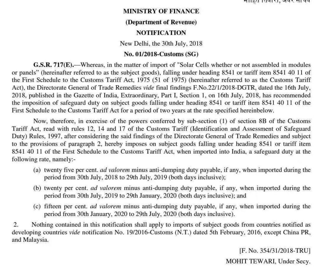 由于被列為“發展中國家”,印度政府對從中國和馬來西亞進口的太陽能電池和組件征收25%的進口關稅以保護國內制造商,但不包括從印度尼西亞和越南進口的太陽能電池和組件。