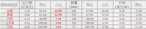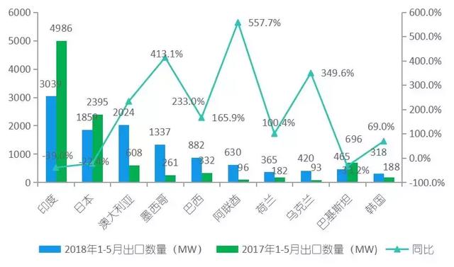 根據中國機電產品進出口商會太陽能光伏產品分會的數據,一方面,印度仍是我國光伏產品出口的第一大市場,另一方面,對印的出口規模正逐漸下滑,尤其是組件,2018年1-5月份對印出口組件數量同比下降了39%。