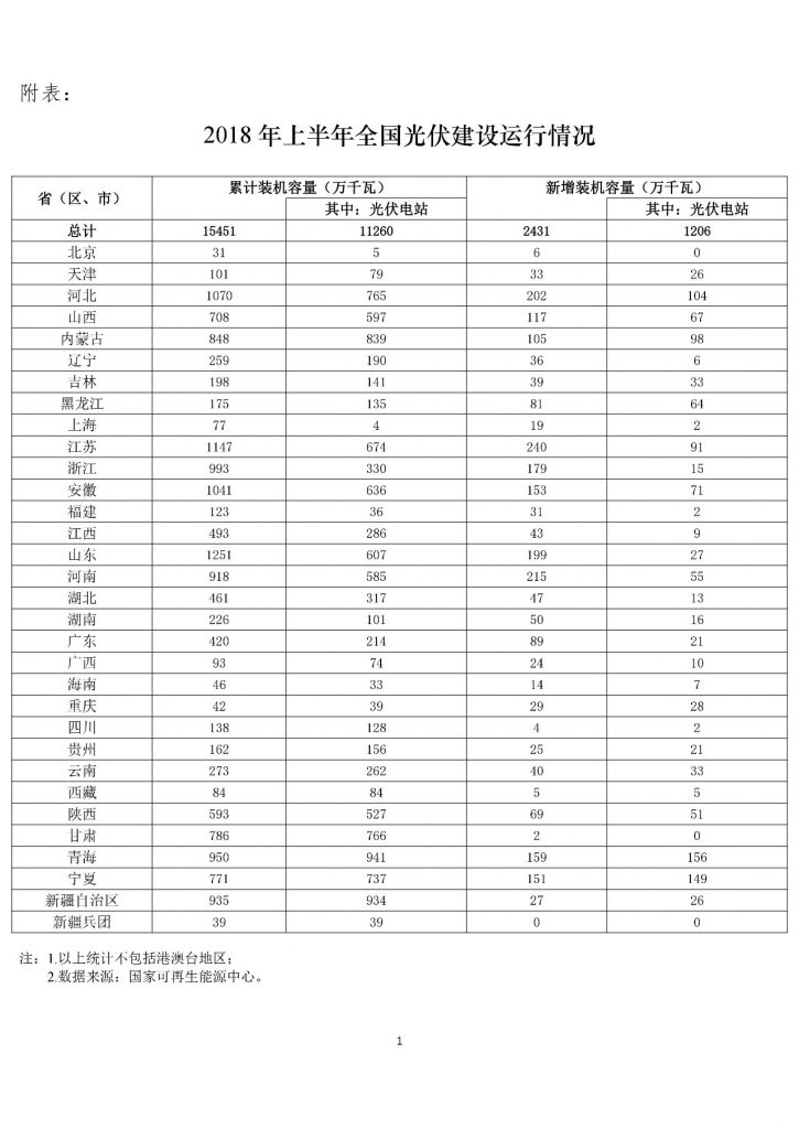 截至2018年6月底,全國光伏發電裝機容量達到15451萬千瓦,其中,光伏電站11260萬千瓦,分布式光伏4190.3萬千瓦。上半年光伏發電量823.9億千瓦時,同比增長59%;棄光率3.6%,同比下降3.2個百分點。棄光主要集中在新疆和甘肅,其中,新疆(不含兵團)棄光電量13.5億千瓦時,棄光率20%,同比下降6.1個百分點;甘肅棄光電量5.9億千瓦時,棄光率11%,同比下降11個百分點。