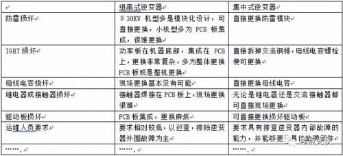 另外,從逆變器維護角度來看,組串式逆變器與集中式逆變器相比,在維修上存在較大差距:組串式逆變器的維修以整機更換為主,對運維人員的技術要求相對較低;集中式逆變器則已局部維修為主,常采用模塊化的更換方式,對運維人員的技術要求相對較高: