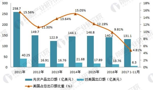 2011-2017年中國光伏產品出口及對美出口情況(單位:億美元,%)