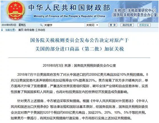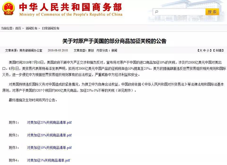 我國商務部也于8月3日晚間連發三個公告,針對美方加征關稅的行為作出回應,并決定對原產于美國的5207個稅目約600億美元商品,加征25%-5%不等的關稅。中美貿易戰愈演愈烈。