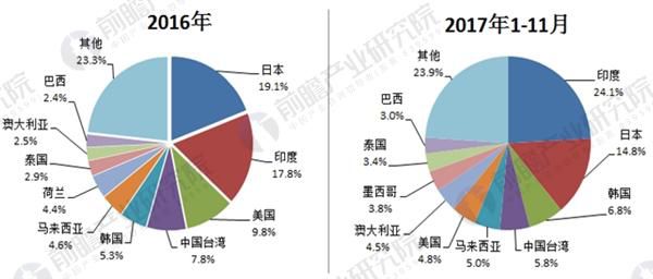 2016-2017年中國光伏產品主要出口國家/地區占比(單位:%)
