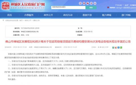 ? ? ? ?8月3日,佛山市禪城區(qū)人民政府門戶網(wǎng)發(fā)布《佛山市禪城區(qū)發(fā)展規(guī)劃和統(tǒng)計(jì)局關(guān)于在建筑物樓頂搭建簡易結(jié)構(gòu)棚安裝光伏發(fā)電設(shè)備相關(guān)規(guī)劃事宜的公告》。公告明確規(guī)定自2018年8月1日起,禪城區(qū)內(nèi)在建筑物樓頂搭建簡易結(jié)構(gòu)棚安裝光伏發(fā)電設(shè)備的規(guī)劃相關(guān)審批事項(xiàng)依以下規(guī)定辦理:
