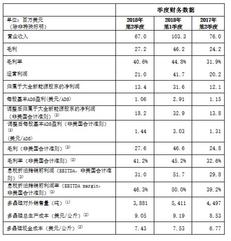 近日,大全發布2018年第2季度未經審計業績報告,摘要如下: