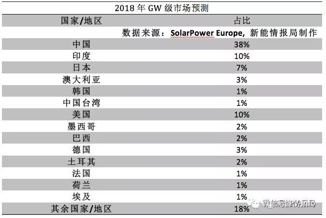 1、日前,歐洲光伏產業協會(Solar power Europe)公布了一組全球光伏市場預測,預計到2018年底,全球將有14個國家及地區光伏裝機量達到吉瓦級水平。而2016年,全球只有7個國家的裝機量超過1吉瓦;2017年,這一數字已增至9個。