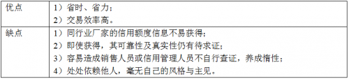 1.同業(yè)比較法。在決定是否和新開發(fā)的經(jīng)銷商做第一筆生意時,W公司會先打聽一下其他同行廠家授予該經(jīng)銷商的信用額度,然后直接設(shè)定相似的信用額度。這種方法目前在國內(nèi)戶用光伏行業(yè)內(nèi)頗為盛行,故又稱“搭便車法”,其優(yōu)缺點如下表。