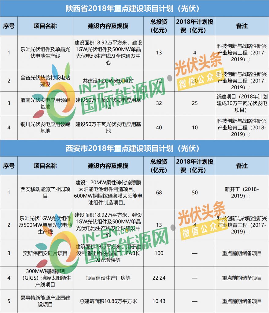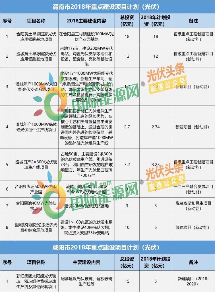 在《陜西省2018年重點建設項目計劃》中,總投資157個億的4大光伏項目甚為搶眼,包括1.2GW光伏扶村級電站建設總投資72億,渭南、銅川領跑者項目72億,可見光伏扶貧、光伏領跑者對陜西光伏行業發展的影響之大!