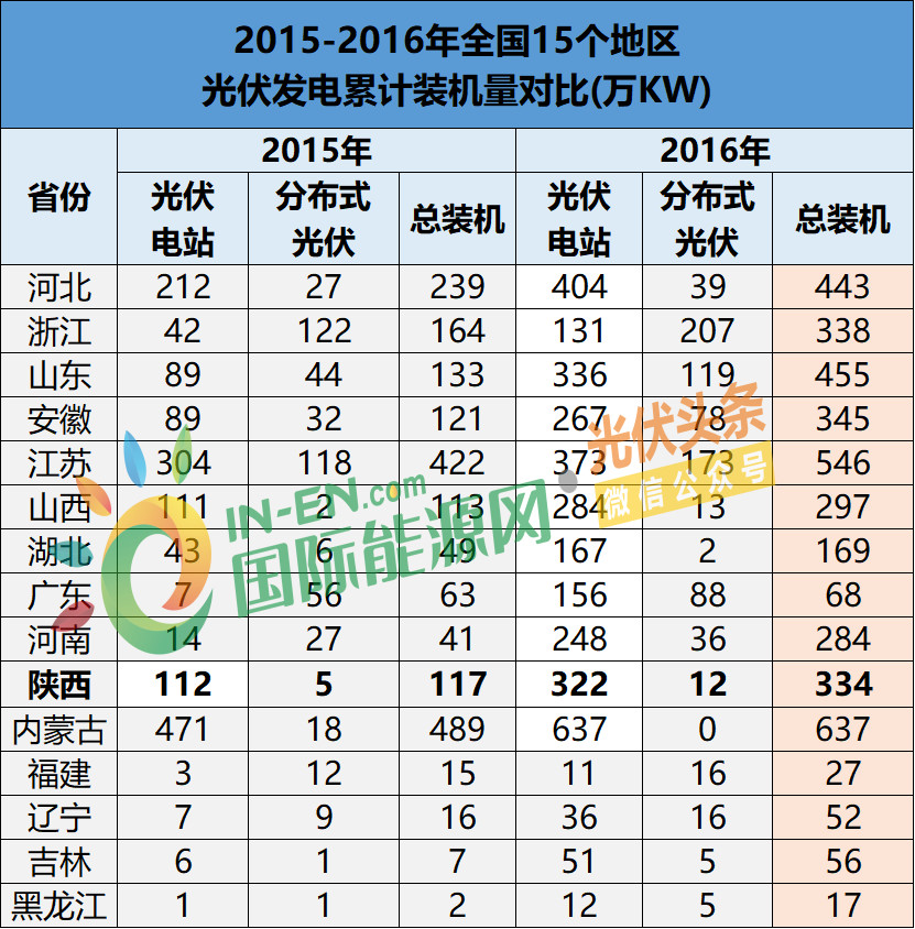 國際能源網/光伏頭條梳理分析了2015-2016年全國15個地區光伏發電裝機量,陜西光伏裝機規模實現跨越式增長,集中式光伏電站裝機規模從2015年的1.12GW躍升到2016年的3.22GW,增幅高達187.5%。