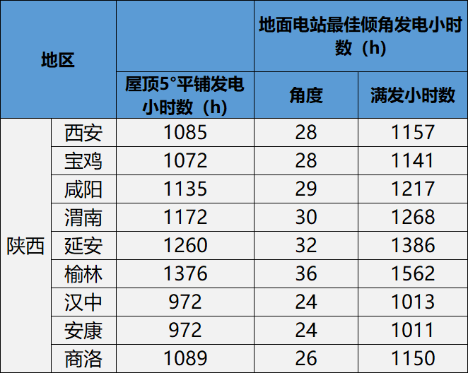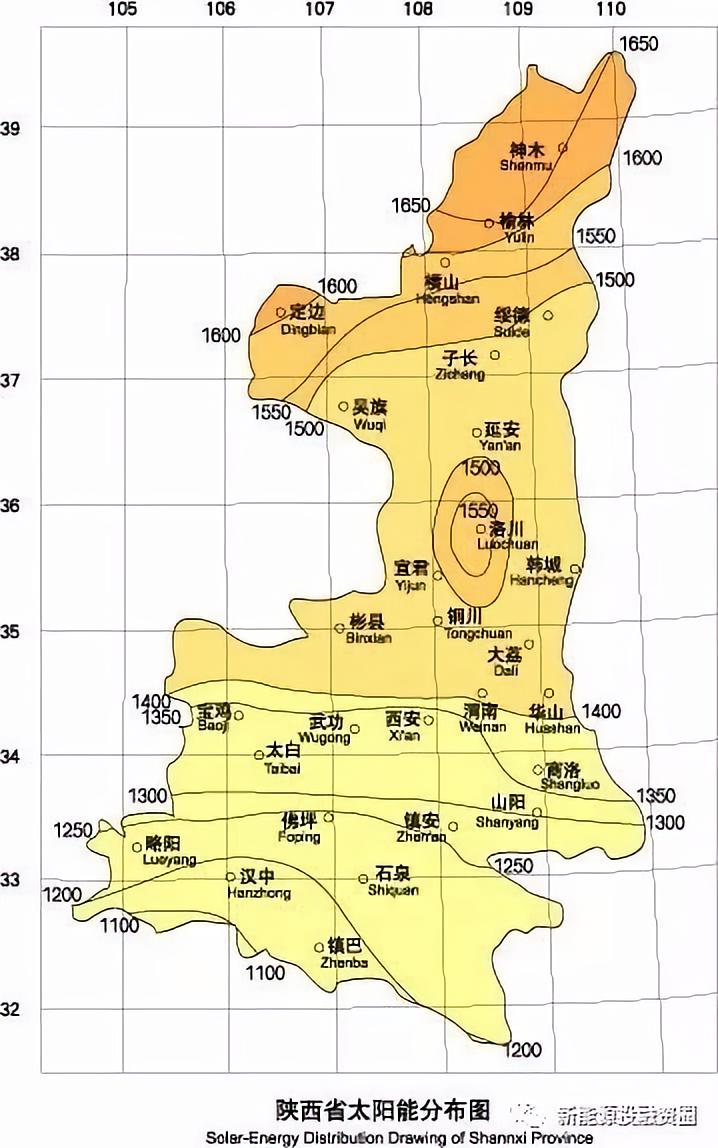 ? ? ? ?陜西省太陽能資源從地域分布來看,從東南向西北逐漸增加。各市的太陽能資源概況見下表。