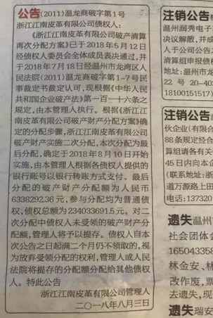 8月8日有媒體發(fā)布公告稱,《浙江江南皮革有限公司破產(chǎn)清算再次分配方案》已于2018年5月12日經(jīng)債權(quán)人委員會全體成員表決通過。公告稱:二次分配將于2018年8月10日開始實施,最后分配的破產(chǎn)財產(chǎn)分配額為人民幣6338292.36元。