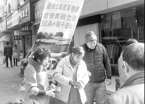 “浙江溫州,浙江溫州,最大皮革廠,江南皮革廠倒閉了!老板黃鶴吃喝嫖賭,欠下了3.5個億,帶著他的小姨子跑了。我們沒有辦法,拿著錢包抵工資。原價都是三百多、二百多、一百多的錢包,通通二十塊,通通二十塊!黃鶴你不是人,我們辛辛苦苦給你干了大半年,你不發(fā)工資,你還我血汗錢,還我血汗錢!”
