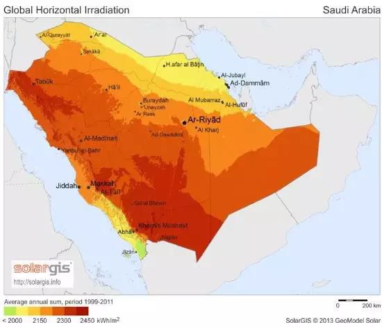 而這些地區,本身的資源量也非常可觀。例如北非,就是世界太陽能輻照最強的地區之一。其中,埃及每年太陽直接輻射達到2000-3000 千瓦時/平方米,太陽從北到南每天照射9-11個小時,太陽能資源非常豐富。但是2016 年,北非和中東的裝機量卻僅有3.4GW,僅占全球的1%。