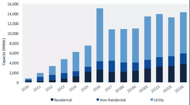 GTM高級分析師Colin Smith在報告中指出,隨著我們邁向2019年,我們預(yù)計采購量將持續(xù)增長,因為開發(fā)商希望在投資稅收抵免(ITC)在2022年降至10%之前確保他們的項目可以并網(wǎng)。”