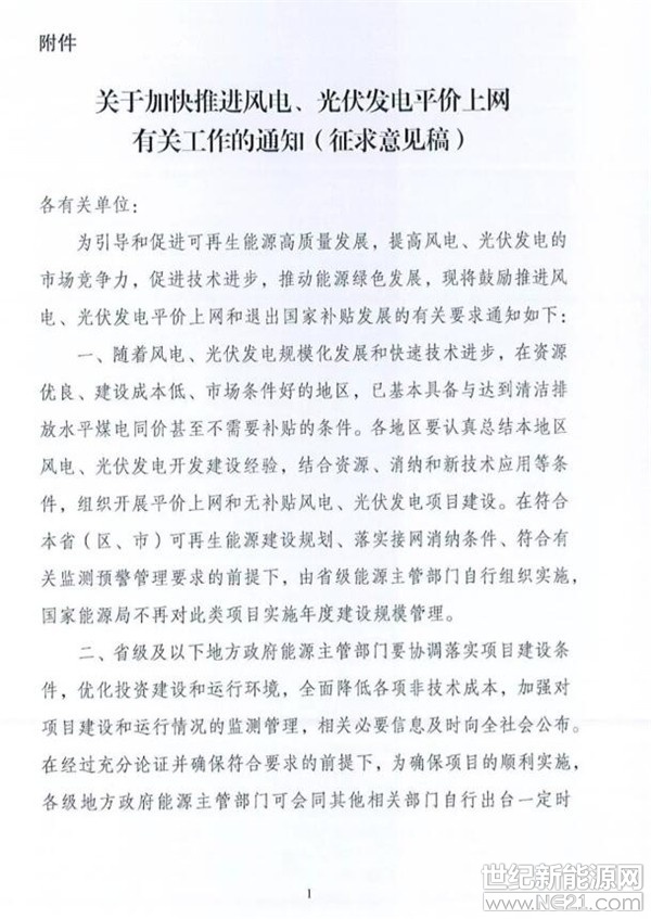 國家能源局公布加快推進風電、光伏平價上網征求意見