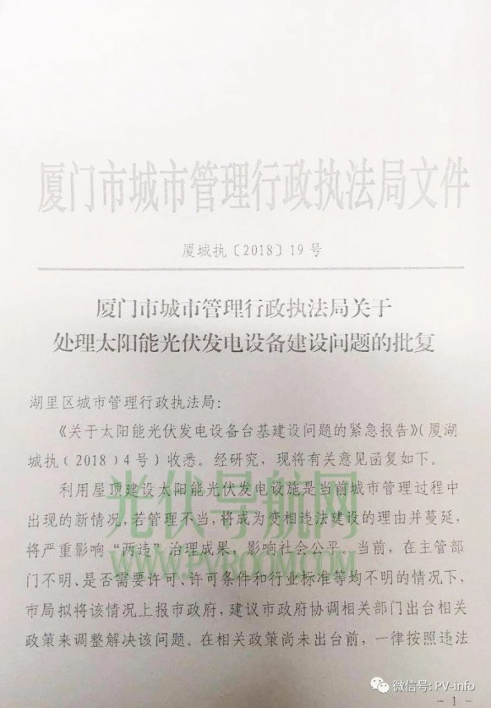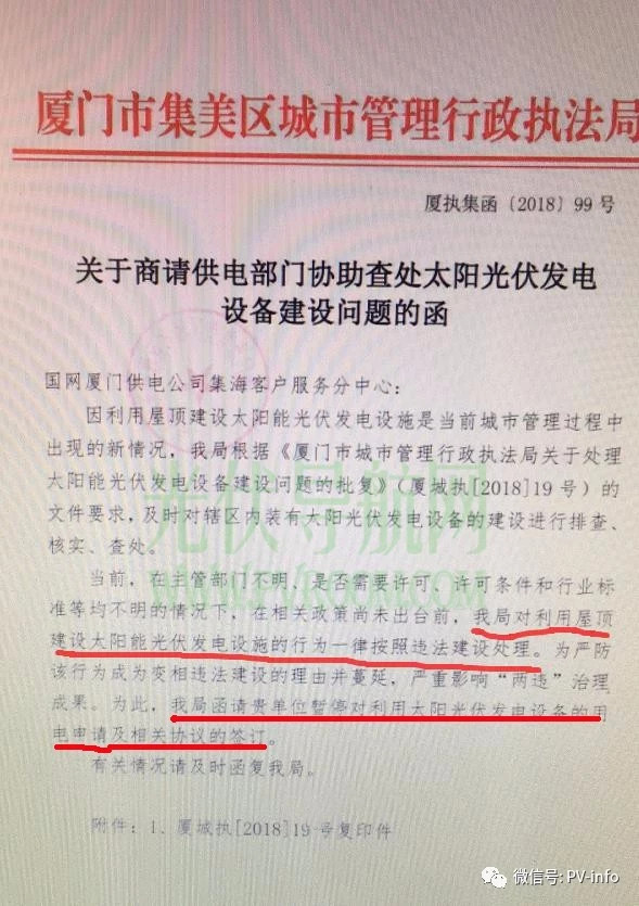 近日,廈門市集美區城市管理行政執法局發布《關于商請供電部門協助查處太陽光伏發電設備建設問題的函》,認定利用屋頂建設太陽能光伏發電設施的行為一律按照違法建設處理,要求供電公司暫停對利用太陽光伏發電設備的用電申請及相關協議的簽訂。