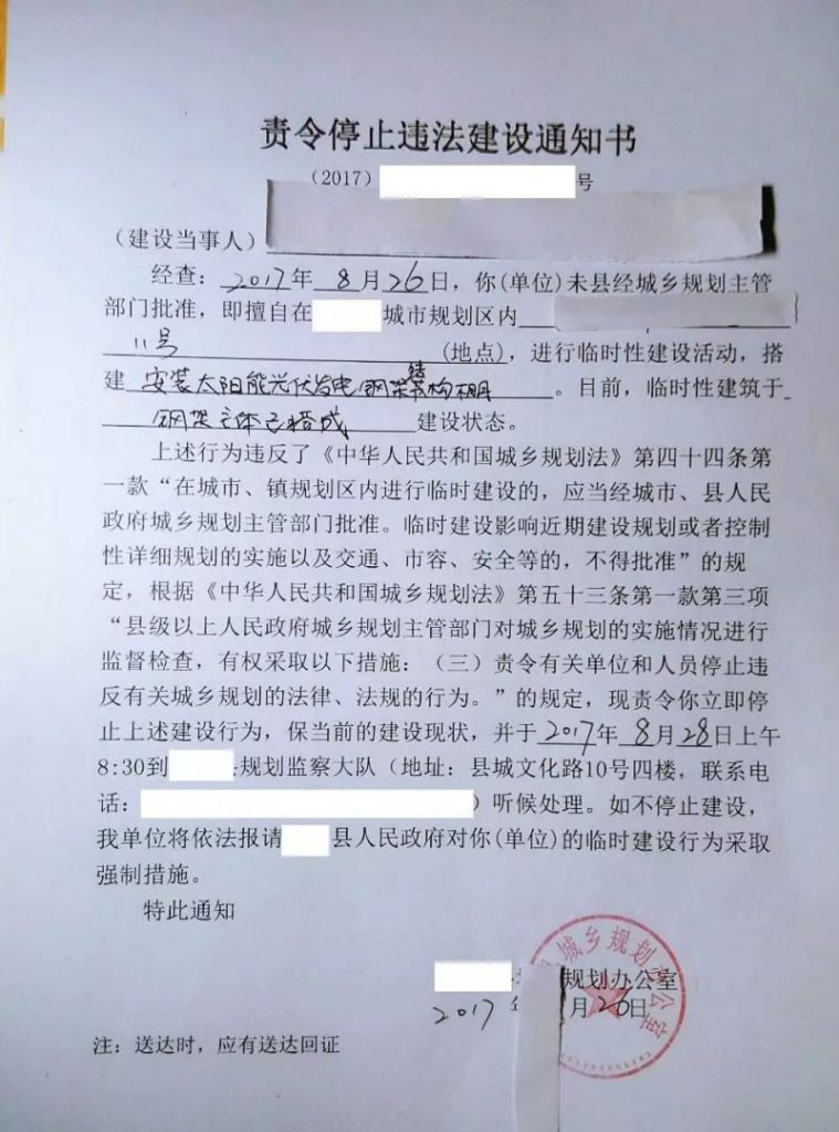 上述幾起拆除案例都是2016年,且均為戶用光伏,大家彼時了解相對較少。近日,河南省洛陽市下屬縣的某單位收到規劃局的文件,該單位樓頂的光伏發電設施屬于違建,被責令拆除!