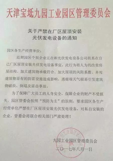 就在不久前,天津市寶坻九園工業園區就出明文規定,禁止在屋頂建設分布式光伏項目。