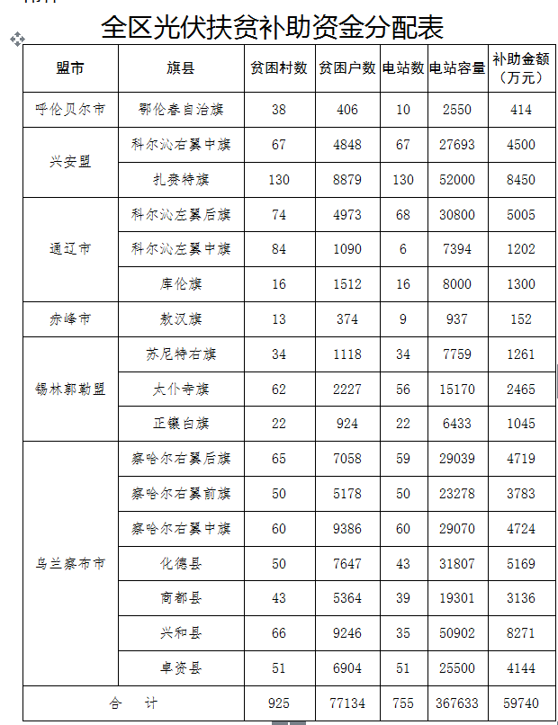 三、精準使用資金。光伏扶貧建設補助資金要嚴格按照《內蒙古自治區發展改革委 扶貧開發辦公室關于下達“十三五”第一批光伏扶貧村級電站項目計劃的通知》(內發改能源字[2018]416號)要求,全部用于我區“十三五”第一批光伏扶貧村級電站項目建設,充分發揮資金使用效益,如期完成電站建設任務。