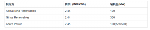 Aditya Birla Renewables和 Giriraj Renewables投標價均為2.44盧比,Azure Power以2.45盧比的價格緊隨其后。此前印度Acme Solar公司曾以2.44盧比的價格中標多個光伏項目。