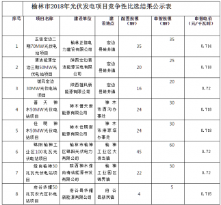 陜西榆林2018年光伏發電項目競爭性比選結果