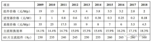 1、我國光伏產(chǎn)業(yè)成本下降 我國2009年開始了第一期光伏特許權(quán)招標工作,商業(yè)化的光伏項目才開始起步。下表為自2009年開始,不同年份的組件、逆變器、系統(tǒng)價格及主流效率的列表。