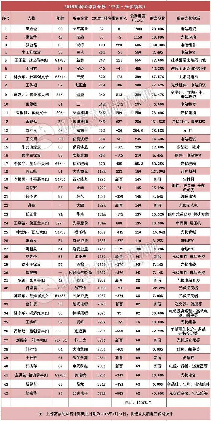 附2018胡潤全球富豪榜(中國·光伏)榜單